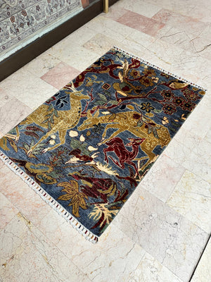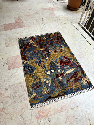 This hand-knotted Afghan rug features a rare animal and nature design, with deer and other wildlife woven into a detailed pictorial scene. Crafted with a wool pile on a cotton foundation (35/40 knot quality) and finished with cotton fringes, it combines artistry with durability. Measuring 148x105 cm (4.8x3.4 ft), this rug is a collectible piece suitable for display, small living spaces, or even as a decorative wall hanging.