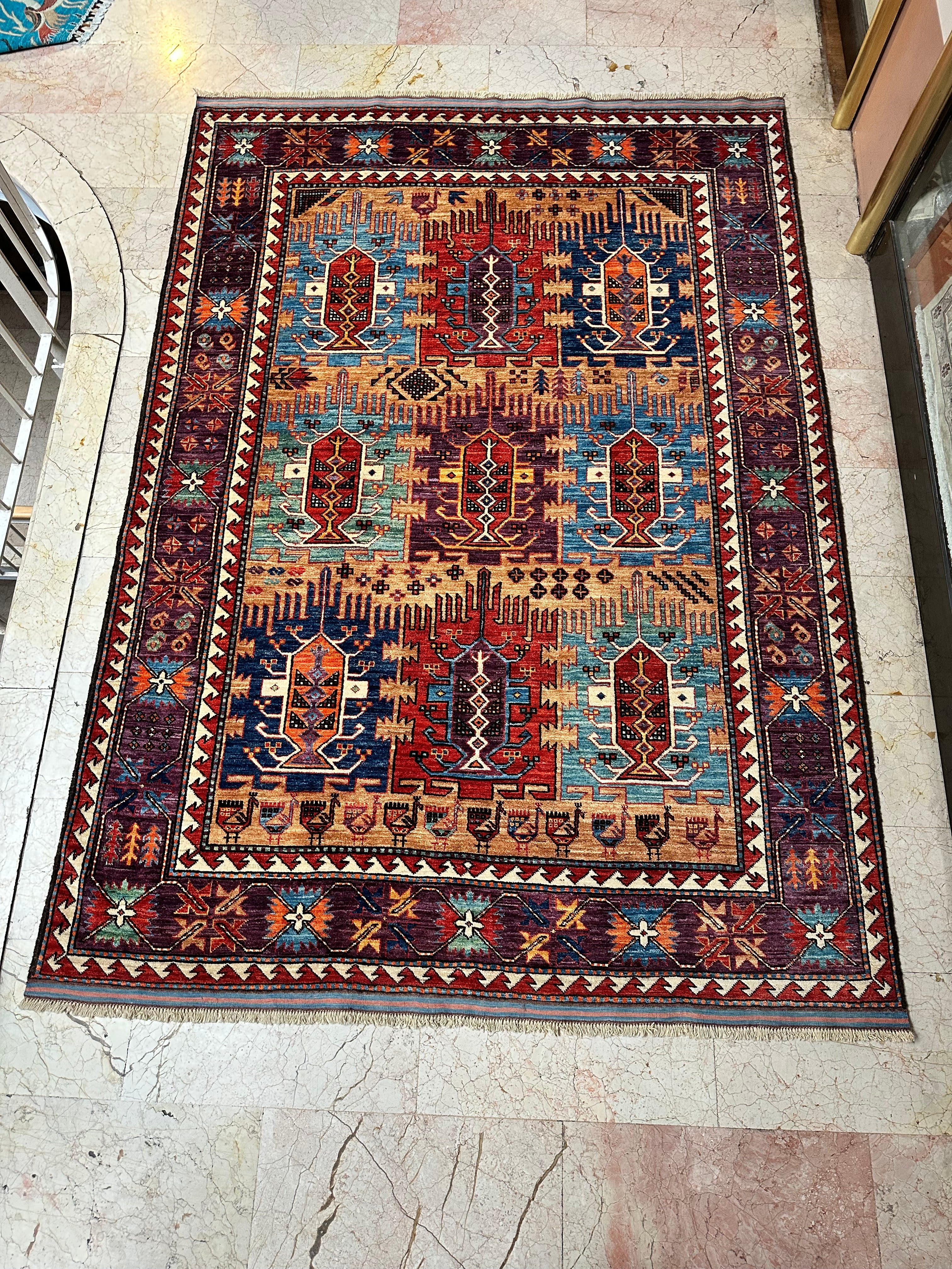 This hand-knotted rug showcases a vibrant tribal design with large geometric and symbolic motifs framed by a richly decorated border. Woven entirely from wool—including pile, foundation, and fringes—at 40/40 knot quality, this piece reflects the strength and artistry of Qashqai weaving traditions. Measuring 248x179 cm (8.1x5.9 ft), it is a large statement rug perfect for living rooms, dining areas, or as a centerpiece in a collector’s home.