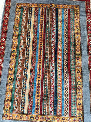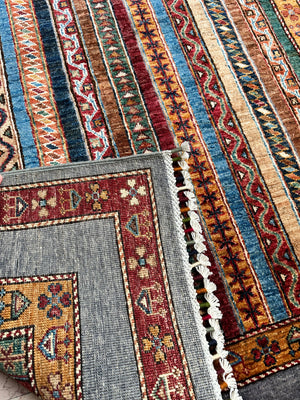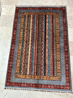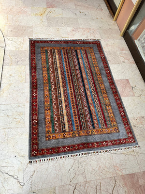 This hand-knotted Afghan Sultani rug features a rare shawl model stripe design with vibrant colors framed by red and grey borders. Woven with a wool pile on a cotton foundation (35/40 knot quality) and finished with cotton fringes, it showcases both durability and artistry. Measuring 180x123 cm (6x4 ft), this rug is perfect for adding color and character to living rooms, bedrooms, or entryways.