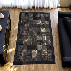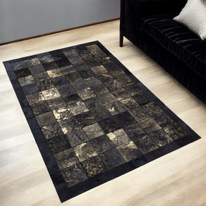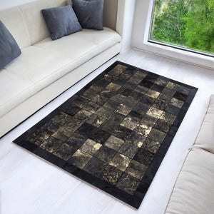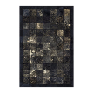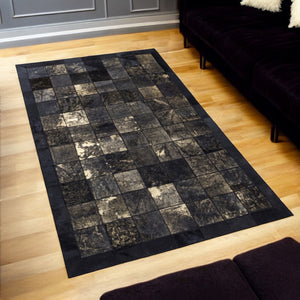 Black Cowhide Patchwork Rug, Gold Detailed Carpet