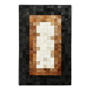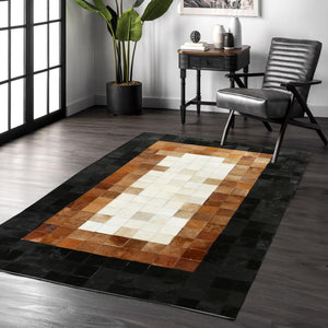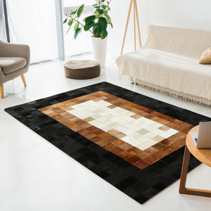 Enhance your living space with the Beige Cowhide Rug featuring a bold brown and black border. This genuine cowhide patchwork carpet blends cream tones with a striking checkered design, making it a perfect fit for farmhouse, rustic, or modern interiors.