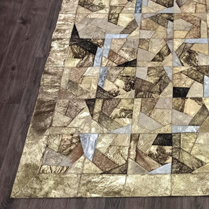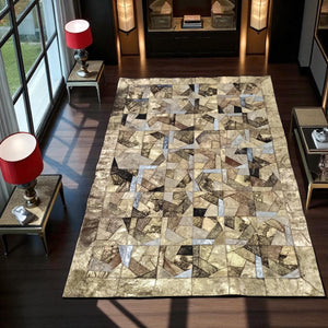 Add sophistication and natural charm to your home with this Golden Patchwork Cowhide Rug. Crafted from 100% genuine cowhide, this rug features a unique patchwork design blending shades of gold, beige, and brown. Each hide piece is meticulously stitched together, creating a one-of-a-kind composition that brings texture, warmth, and elegance to any room.