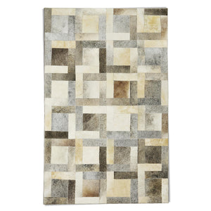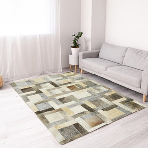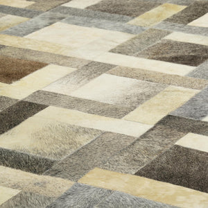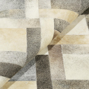 Introduce sophistication and warmth to your home with the Beige & Grey Cowhide Patchwork Rug. Featuring a striking geometric pattern, this genuine calfskin carpet effortlessly combines natural textures with modern design, making it a standout piece for living rooms, bedrooms, or offices.