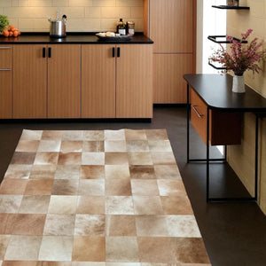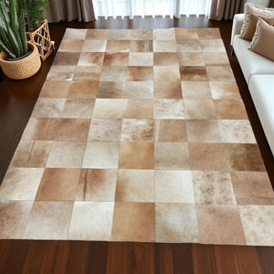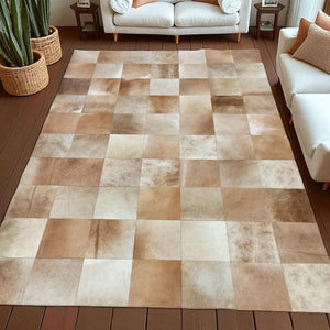 Beige Patchwork Cowhide Rug, Natural Leather Area Rug for Living Room or Office