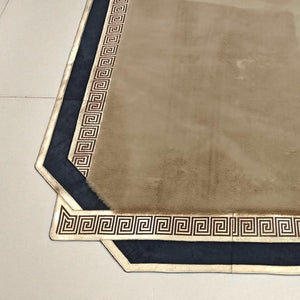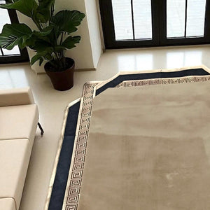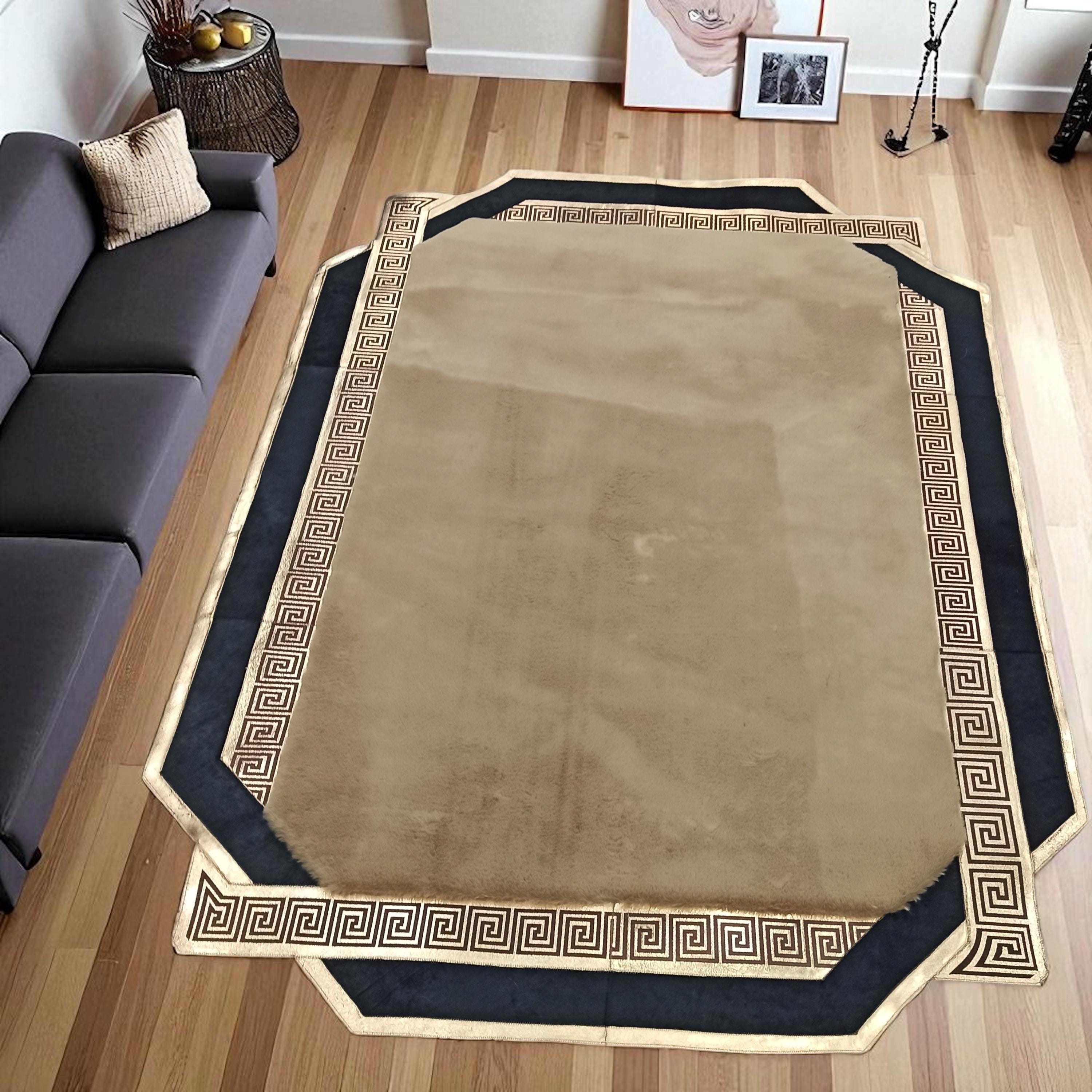 This beige rectangular rug offers a minimalist yet luxurious look with its velvety soft surface and black Greek key border. Handcrafted with care, this high-pile fur texture provides warmth and visual richness to your space. Ideal for living rooms, bedrooms, or lounge areas, it adds a refined touch to any decor style while remaining incredibly comfortable underfoot.