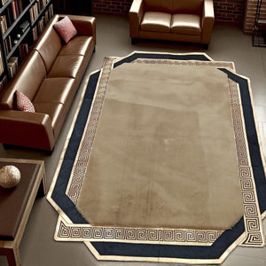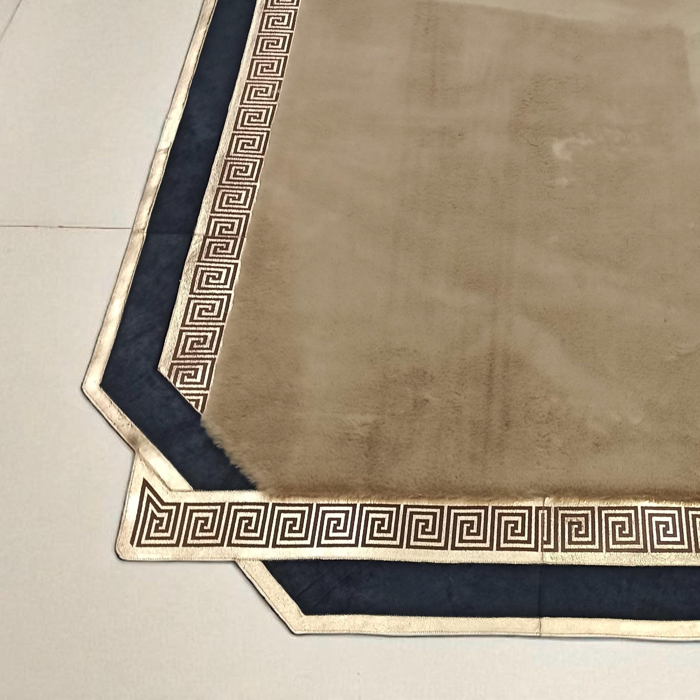 Beige Rectangular Soft Fur Rug with Black Greek Border, Custom Size Cozy Living Room Plush Carpet, Fluffy Decorative Area Rug