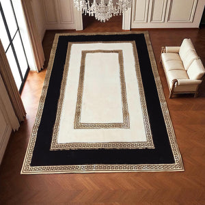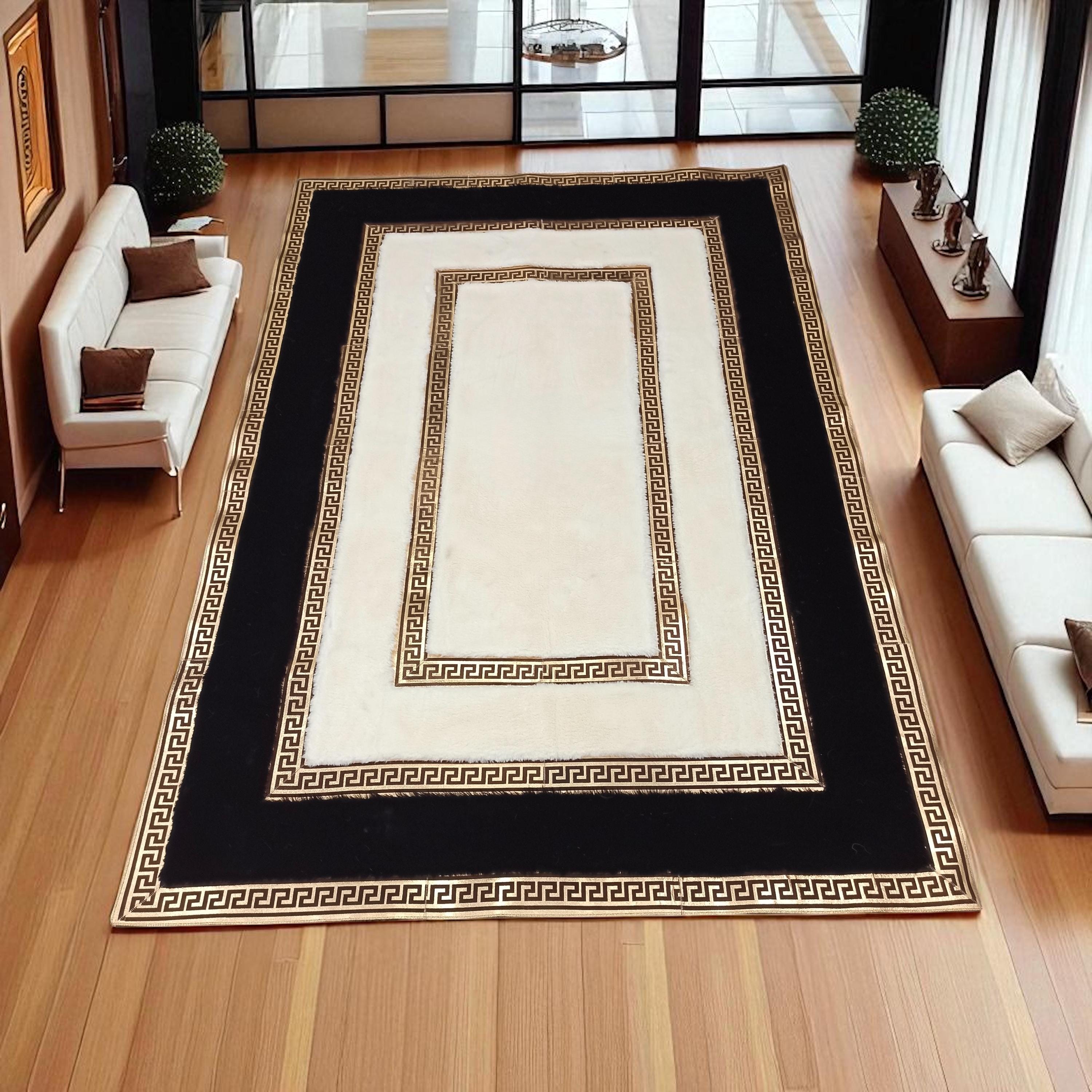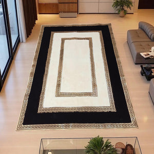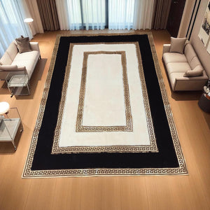 Black and Cream Soft Plush Area Rug, Greek Key Border Large Living Room Carpet, Custom Size Shaggy Floor Rug