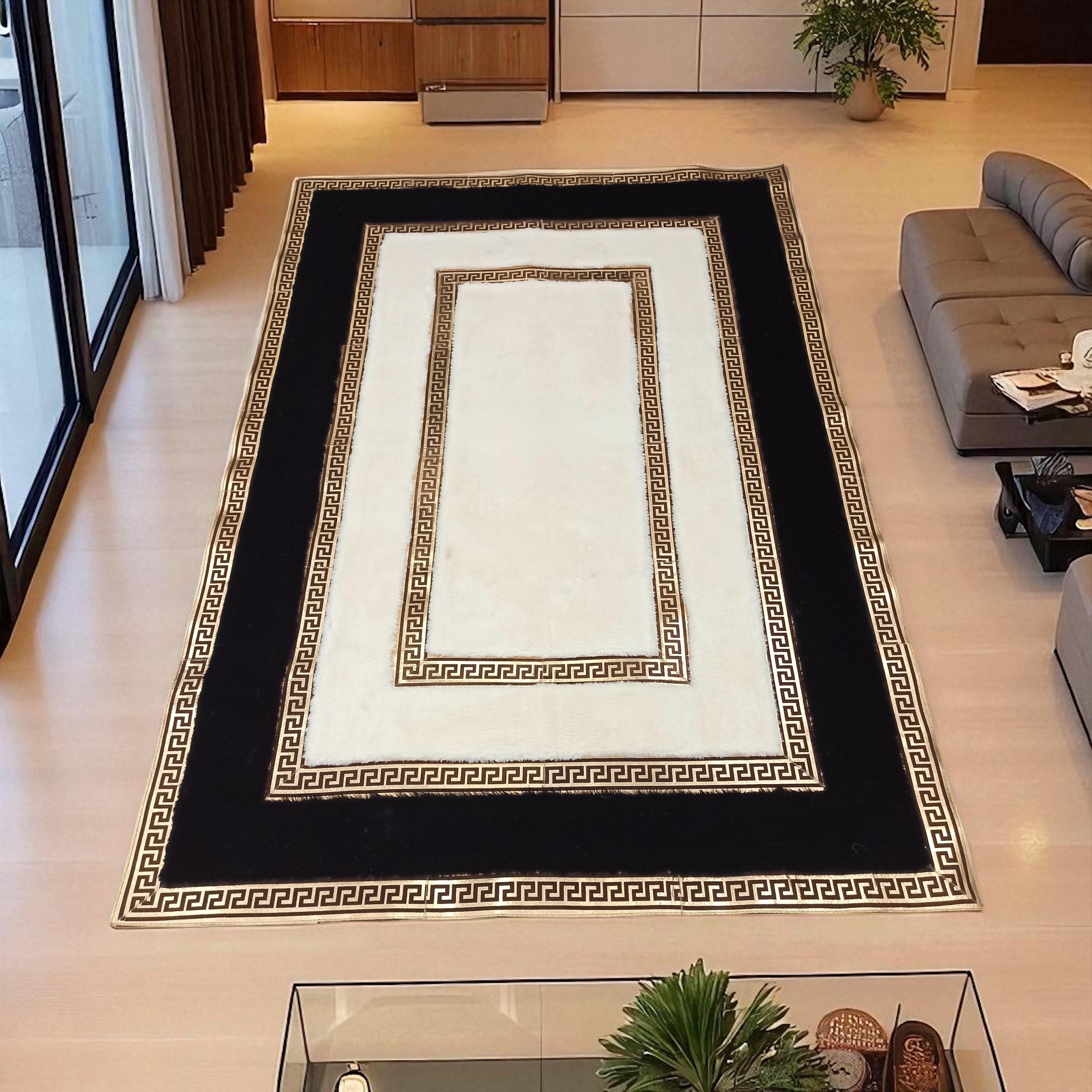 This plush faux fur rug features a bold contrast of deep black and creamy white, outlined by an elegant Greek key border. Designed for both comfort and style, its ultra-soft texture provides a cozy surface while elevating any room with a sense of luxury. Whether placed in a living room, bedroom, or office, this handmade rug offers timeless design and exceptional softness underfoot. Its custom sizing makes it a versatile fit for both compact and expansive spaces.