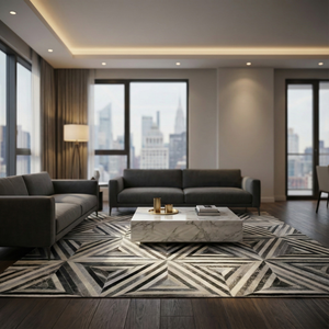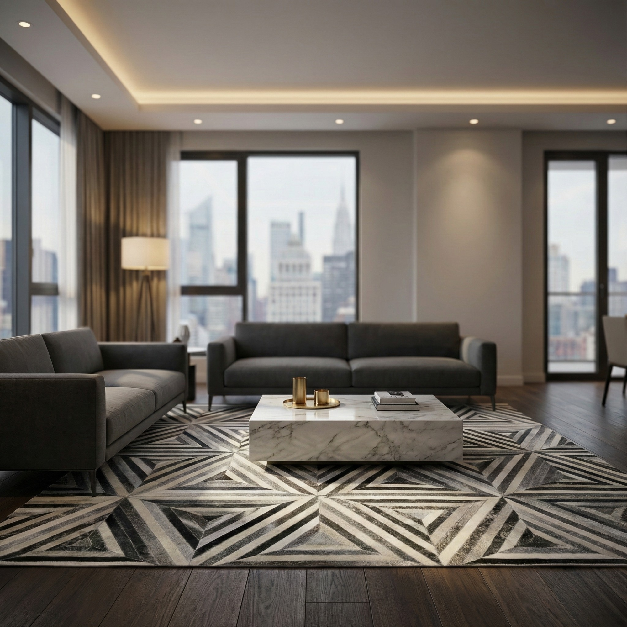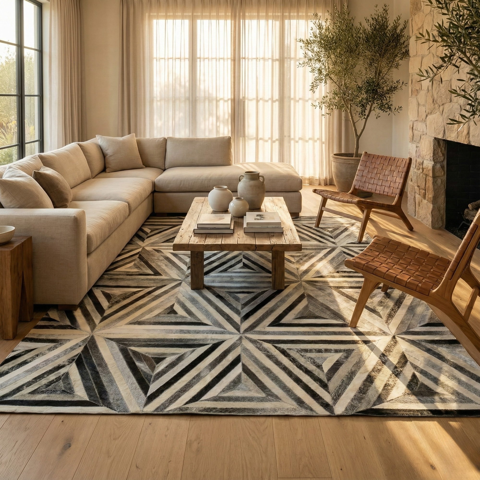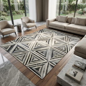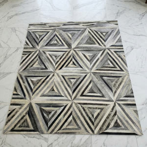 Handcrafted from 100% genuine leather, this rug features a bold triangular geometric design in black, grey, and soft neutral tones, creating a striking yet balanced statement piece.