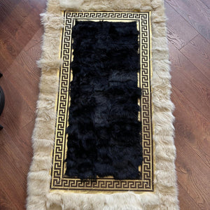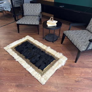 Add a touch of opulence to your home with this Black & Cream Sheepskin Fur Rug. Crafted from genuine sheepskin, this elegant shaggy rug features a luxurious combination of soft black and cream tones, framed with a striking gold border. Perfect for creating a cozy and sophisticated ambiance, it seamlessly fits into modern, rustic, or contemporary decor themes.