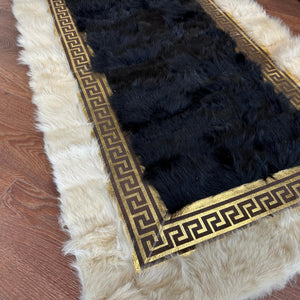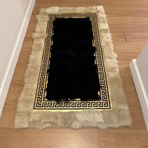 Black Tuscan Rectangular Rug with Gold Border and Cream Fur Frame, Custom Size Available