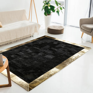Add a touch of luxury to your home with our Black & Gold Genuine Cowhide Rug. This stunning black patchwork rug with a gold border combines timeless elegance with modern design, making it a perfect centerpiece for your living room, bedroom, or office space.