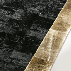 Handcrafted from authentic cowhide, this luxury leather rug is soft, durable, and easy to maintain. Its sleek black tones accented by a radiant gold border create a statement piece that complements both contemporary and classic interiors.