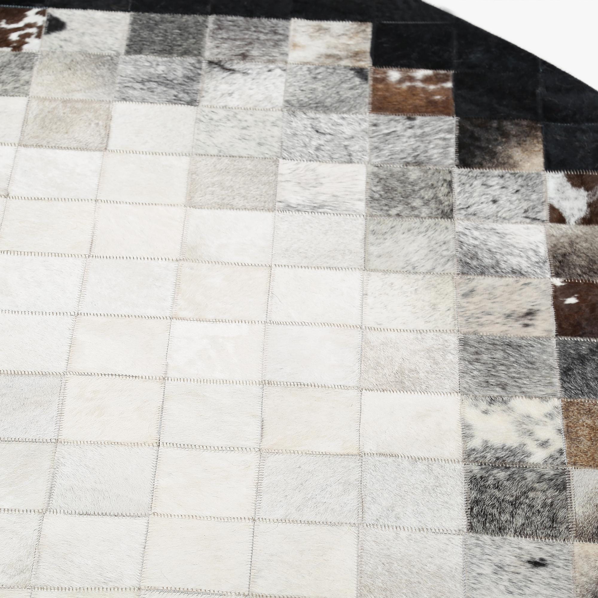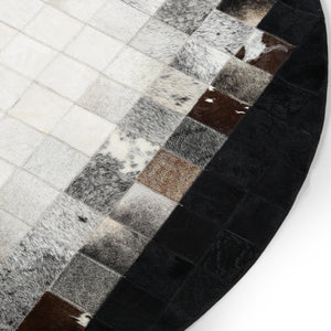 This round cowhide rug is handmade with a patchwork ombre design that fades from white in the center to black on the edges. Durable and stylish, it is a perfect statement piece for living rooms, bedrooms, or entryways.