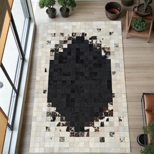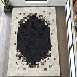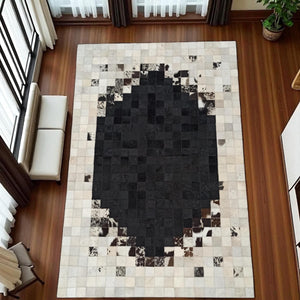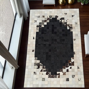 Black Center Cowhide Patchwork Rug, Handmade Natural Leather Carpet