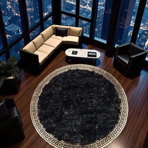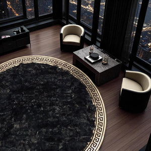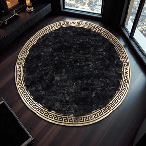 This Round Black Toskana Leather Rug showcases refined elegance and meticulous craftsmanship. Made from 100% genuine Toskana leather, it features a soft, rich texture with a beautifully detailed Greek-inspired border. Its deep black tone adds a sophisticated accent to any space, blending natural luxury with timeless design.