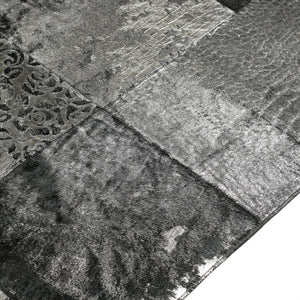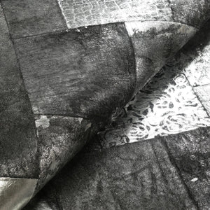 Transform your home with the Black & Silver Leaf Cowhide Area Rug, a luxurious piece that blends natural beauty with contemporary elegance. This genuine calfskin patchwork carpet features a sleek black base adorned with shimmering silver leaf accents, making it a perfect addition to modern living rooms, bedrooms, or sophisticated offices.