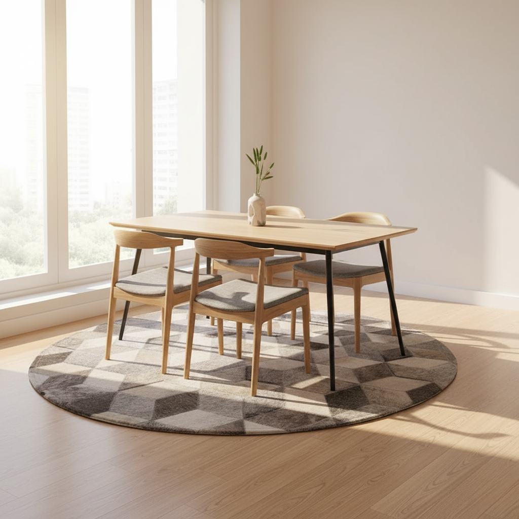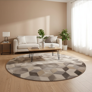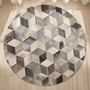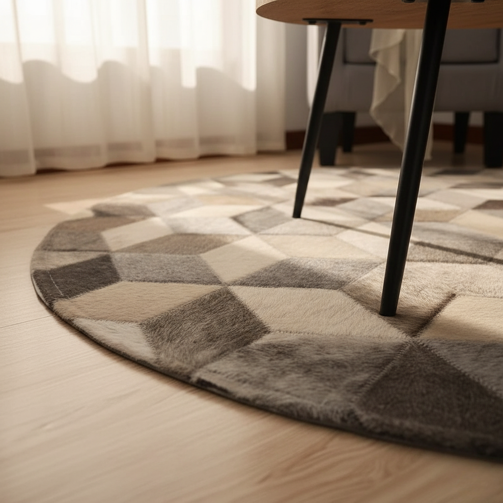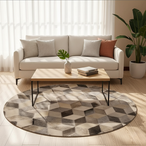This elegant round patchwork cowhide rug blends natural tones of beige, grey, and soft earthy shades in a unique geometric pattern. Handcrafted from genuine hair-on-hide leather, each panel is carefully selected and stitched together to create a smooth, dimensional layout that adds warmth and sophistication to any room. The circular shape enhances flow in your living space while the neutral palette harmonizes beautifully with a wide range of interior styles.