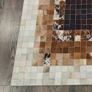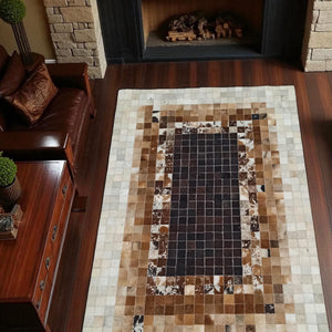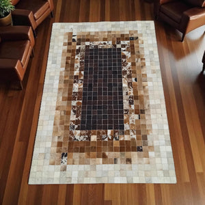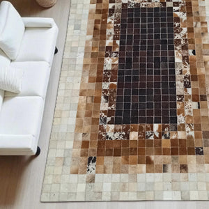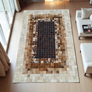 Brown and Beige Cowhide Patchwork Rug, Handmade Natural Leather Carpet