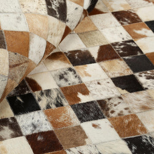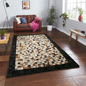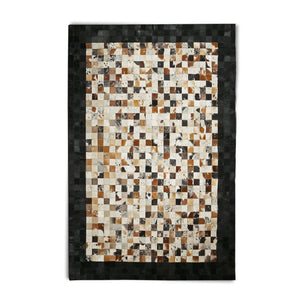 Add a touch of elegance and rustic charm to your home with this Brown Cowhide Patchwork Rug with Black Border. Expertly handcrafted from genuine calfskin, this rug combines a rich brown hue with a striking black border for a sophisticated contrast. Its unique texture highlights the natural beauty of cow skin, making it a centerpiece in any living room or study.