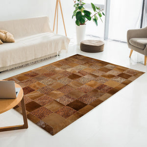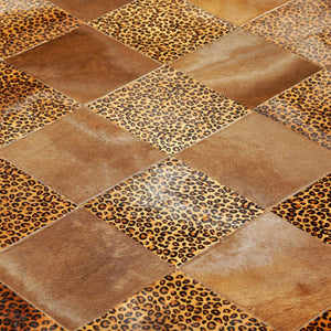 Brown Leopard Print Cowhide Patchwork Rug, Handmade Genuine Leather Area Carpet