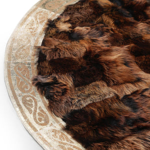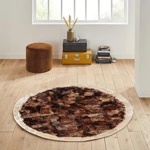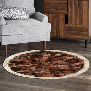 Round Brown Cowhide Rug with Gold Border, Handmade Patchwork Leather Carpet