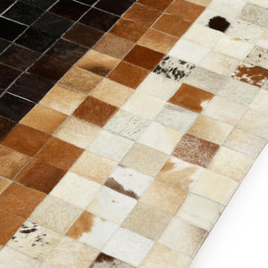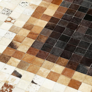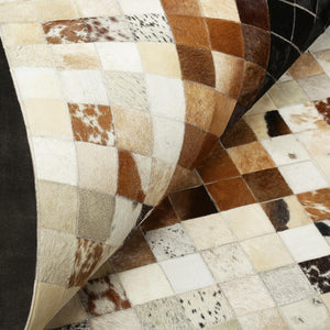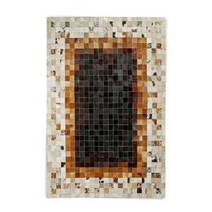 Brown Checkered Patchwork Cowhide Rug with Cream Border