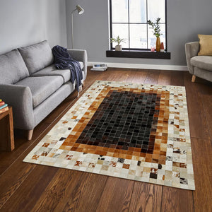 Elevate your home decor with the Brown Patchwork Cowhide Rug with Cream Border, a luxurious handcrafted piece made from genuine cowhide. Featuring a checkered design in rich brown tones accented by a subtle cream border, this rug combines modern aesthetics with rustic charm. Perfect for living rooms, offices, or bedrooms, its geometric pattern and natural texture bring warmth and sophistication to any space. Durable and easy to maintain, this cowhide rug is both functional and stylish.