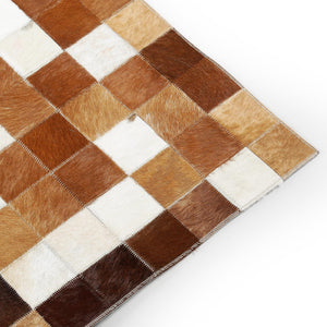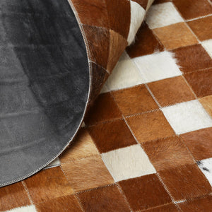 Transform your living space with the natural beauty of our Brown & White Patchwork Calfskin Carpet. This genuine cowhide carpet features a stunning checkered pattern, seamlessly combining brown and white cow skin pieces for a rustic yet elegant look. Crafted from 100% natural leather, this patchwork cowhide rug offers exceptional durability and a unique texture that enhances any room's aesthetic.
