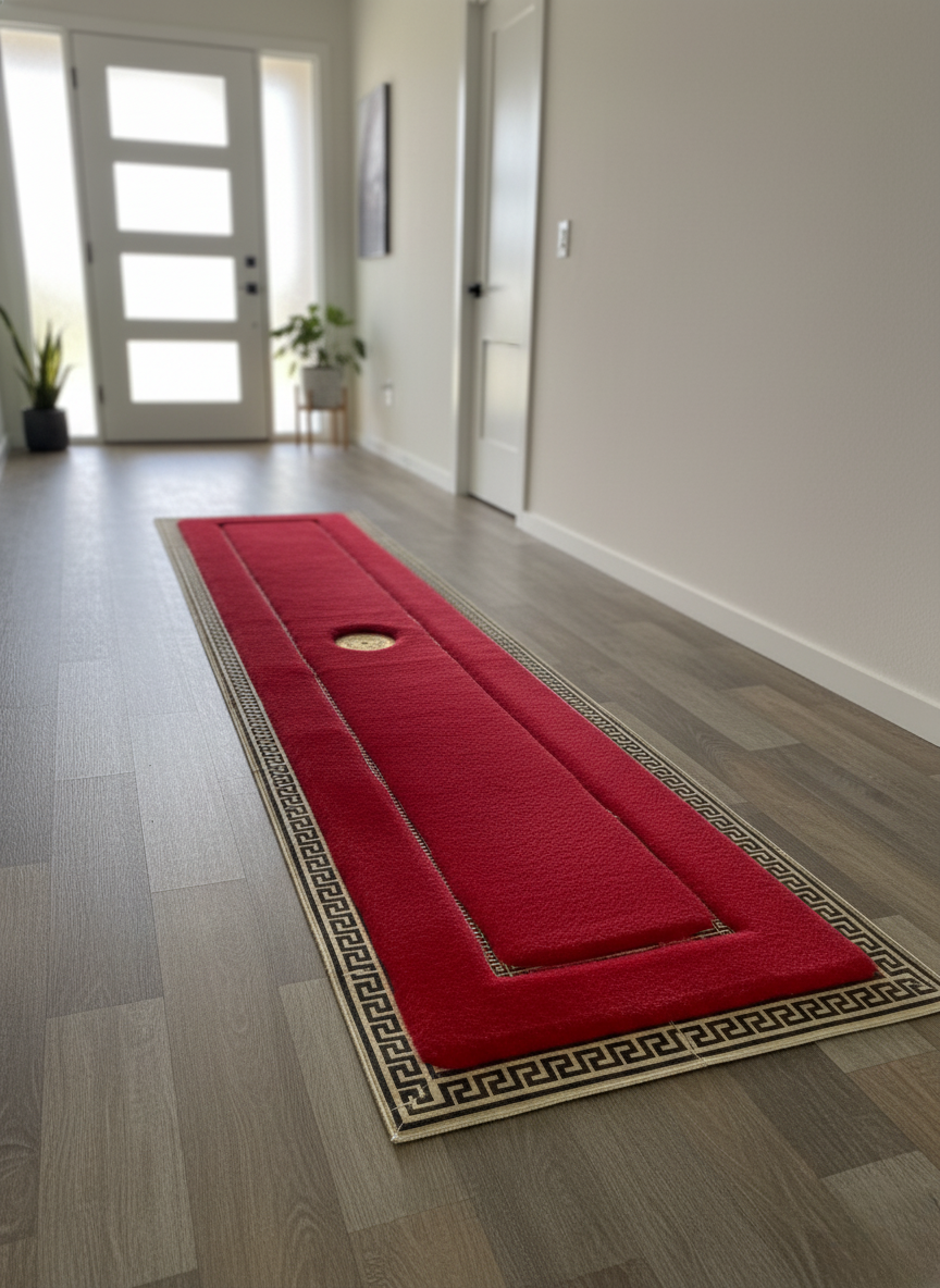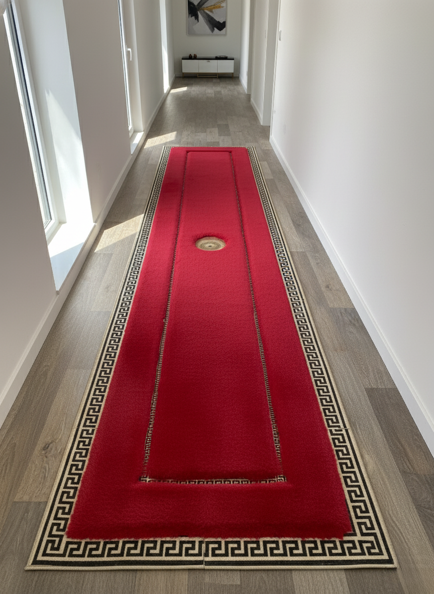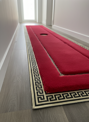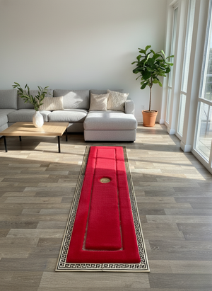 Red Plush Runner Rug – Gold Accent Detailing, Ultra-Soft Texture, Non-Slip Backing, Custom Sizes Available