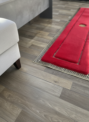 • Design: Rich red plush surface with gold linear detailing and a central medallion.
