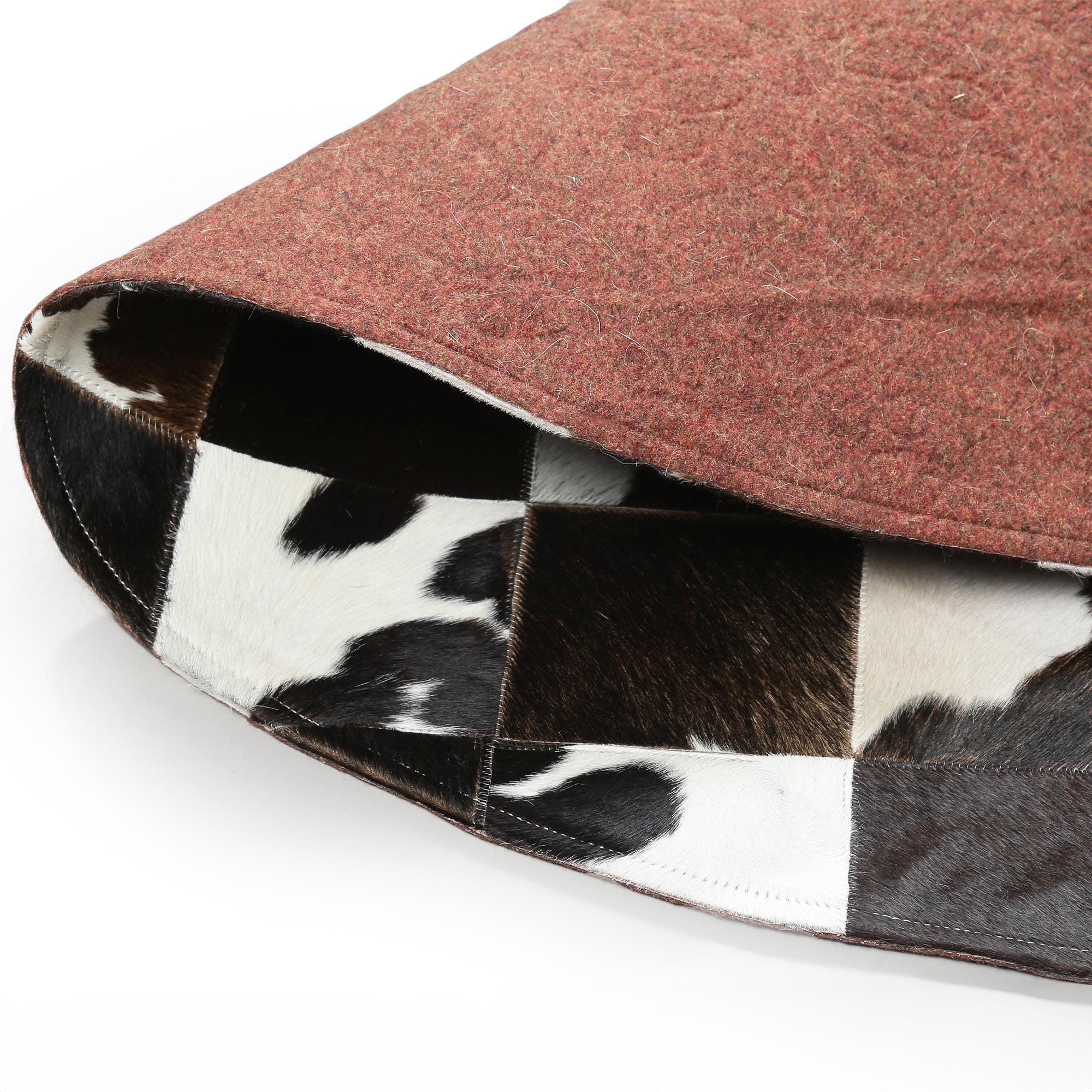 This round cowhide rug is handmade with a patchwork design in natural brown and white tones. Durable and stylish, it adds warmth and authenticity to living rooms, bedrooms, or entryways.
