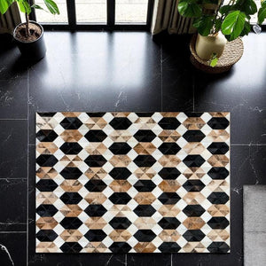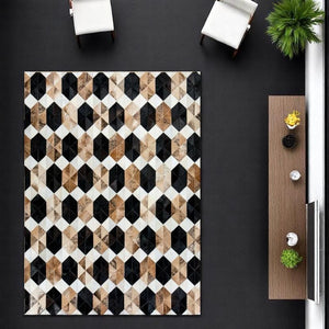 Add a luxurious statement to your decor with this Brown and Black Patchwork Cowhide Rug. Crafted from 100% genuine cowhide, this rug features an elegant diamond pattern highlighted with gold and silver metallic accents. The combination of natural texture and metallic sheen creates a sophisticated balance of rustic charm and modern elegance, perfect for living rooms, offices, or contemporary interiors.
