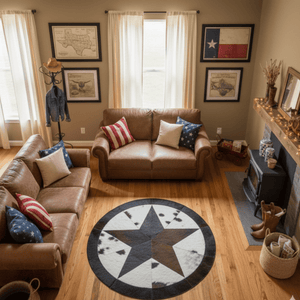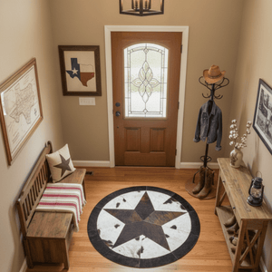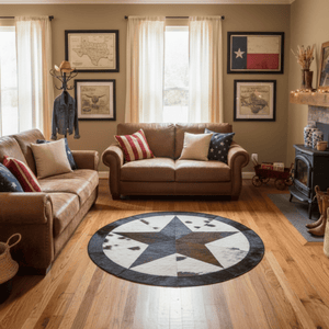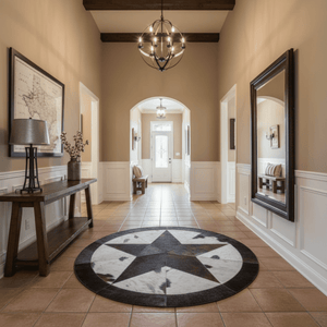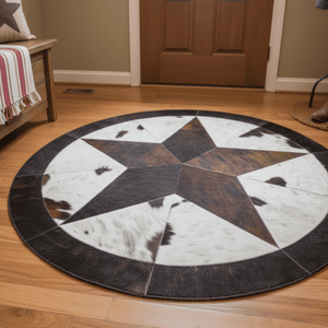 Add rustic charm and bold design to your home with this Round Star Pattern Cowhide Rug. Made from 100% genuine cowhide, it features a striking star motif in shades of black, brown, and ivory. The natural texture and handcrafted precision give this rug a unique character, making it a perfect statement piece for living rooms, offices, or lounges.