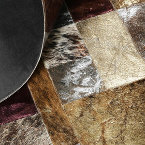 Transform your living space with the Cowhide Rug with Gold, Bronze & Red Leaf accents. This luxurious genuine calfskin patchwork carpet features a striking blend of metallic tones, making it a centerpiece in any modern living room. The natural cowhide texture combines durability with sophistication, creating a unique statement piece. Perfect for contemporary interiors, this real cow skin rug is ideal for adding warmth and elegance to your home. Its handcrafted design ensures top-notch quality and style, making it a thoughtful gift for housewarming or special occasions.