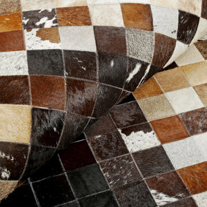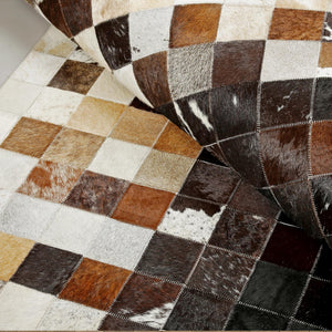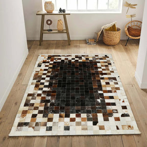Cream, Brown & Black Checkered Patchwork Cowhide Rug