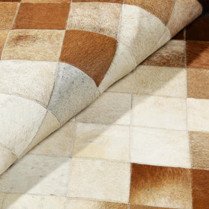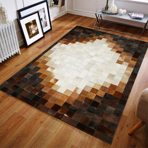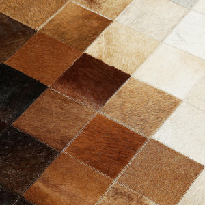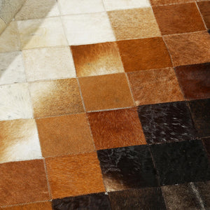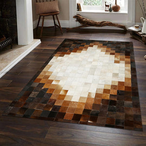 Add a sophisticated touch to your home with this Dark Brown & Beige Cowhide Patchwork Rug, a blend of natural elegance and modern design. Featuring an ombre effect and a diamond-pattern checkered layout, this rug is crafted from genuine calfskin, ensuring a soft and luxurious texture. Its earthy tones and timeless design make it a versatile addition to any living room, bedroom, or office. Durable and unique, this rug is perfect for enhancing your décor or gifting as a houghtful present for a new home.