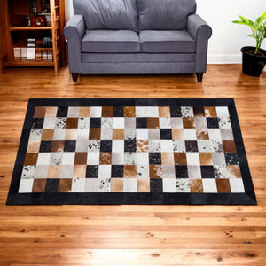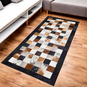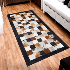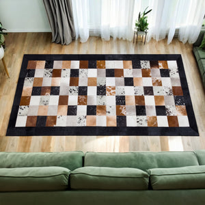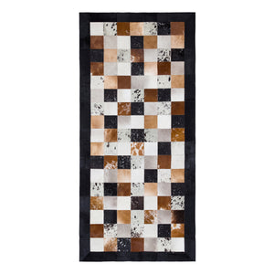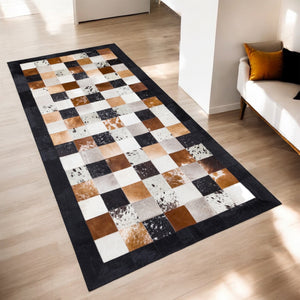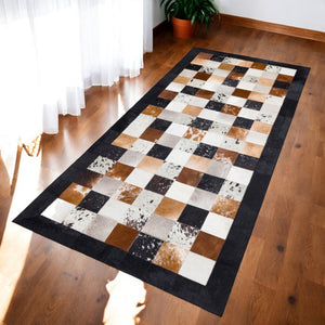 Multicolor Cowhide Patchwork Rug with Black Border, Hallway or Entryway Carpet