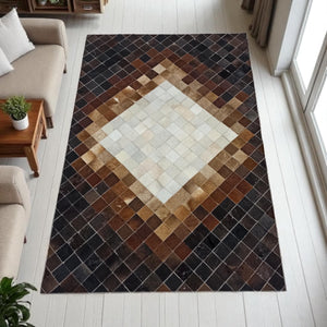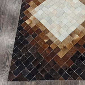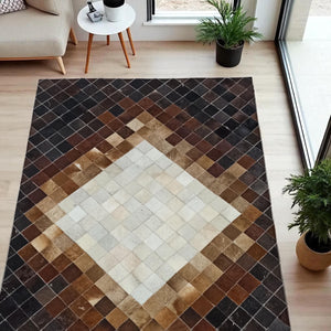 Add a striking touch of natural sophistication to your home with this Diamond Pattern Patchwork Cowhide Rug. Crafted from 100% genuine cowhide, it features a bold diamond motif that transitions beautifully from deep espresso to warm caramel and light beige tones. Each square piece is hand-stitched, creating a refined design that perfectly complements both modern and rustic interiors.