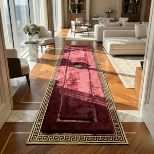 Add warmth, softness, and modern elegance to your home with this Burgundy Plush Runner Rug. Crafted with a dense, ultra-soft plush texture, it offers a smooth and comfortable feel underfoot while enhancing long hallways and entry passages with its rich color. The gold accent lines and central medallion bring a refined, luxurious touch, making this runner a standout element in any contemporary or classic interior.