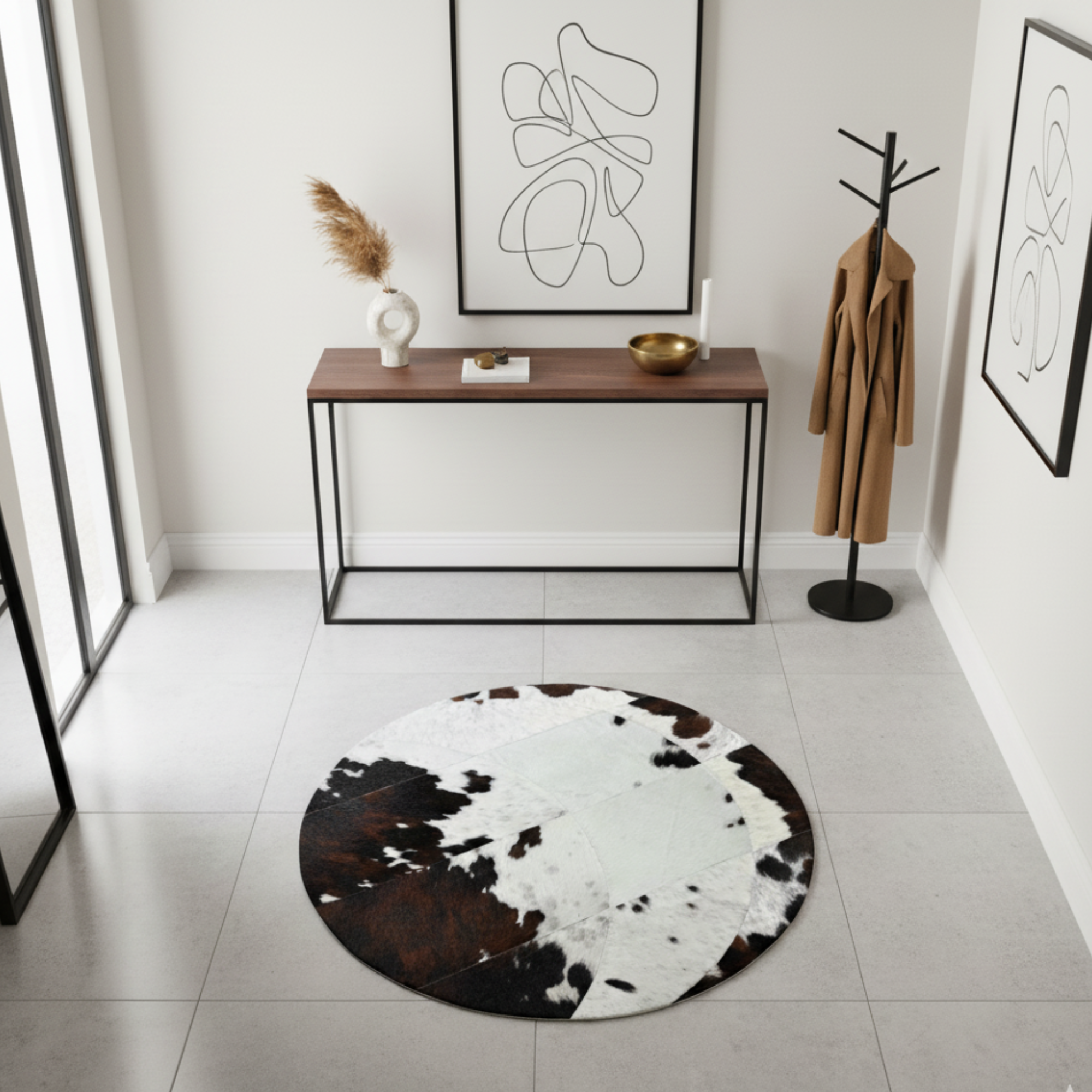 This handmade round patchwork rug is crafted from 100% genuine cowhide. The natural black, brown, and white tones create a bold and authentic look, making it a unique addition to your home. Each piece is carefully stitched together, ensuring both durability and timeless style. Perfect for living rooms, entryways, or offices, this rug combines rustic elegance with modern design.