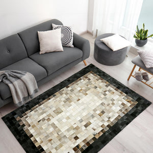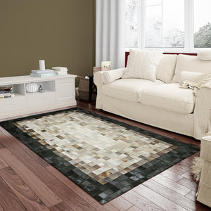 Gray Beige and Black Border Cowhide Patchwork Rug, Handmade Genuine Leather Area Carpet, Natural Cowhide Rug for Modern Living Room