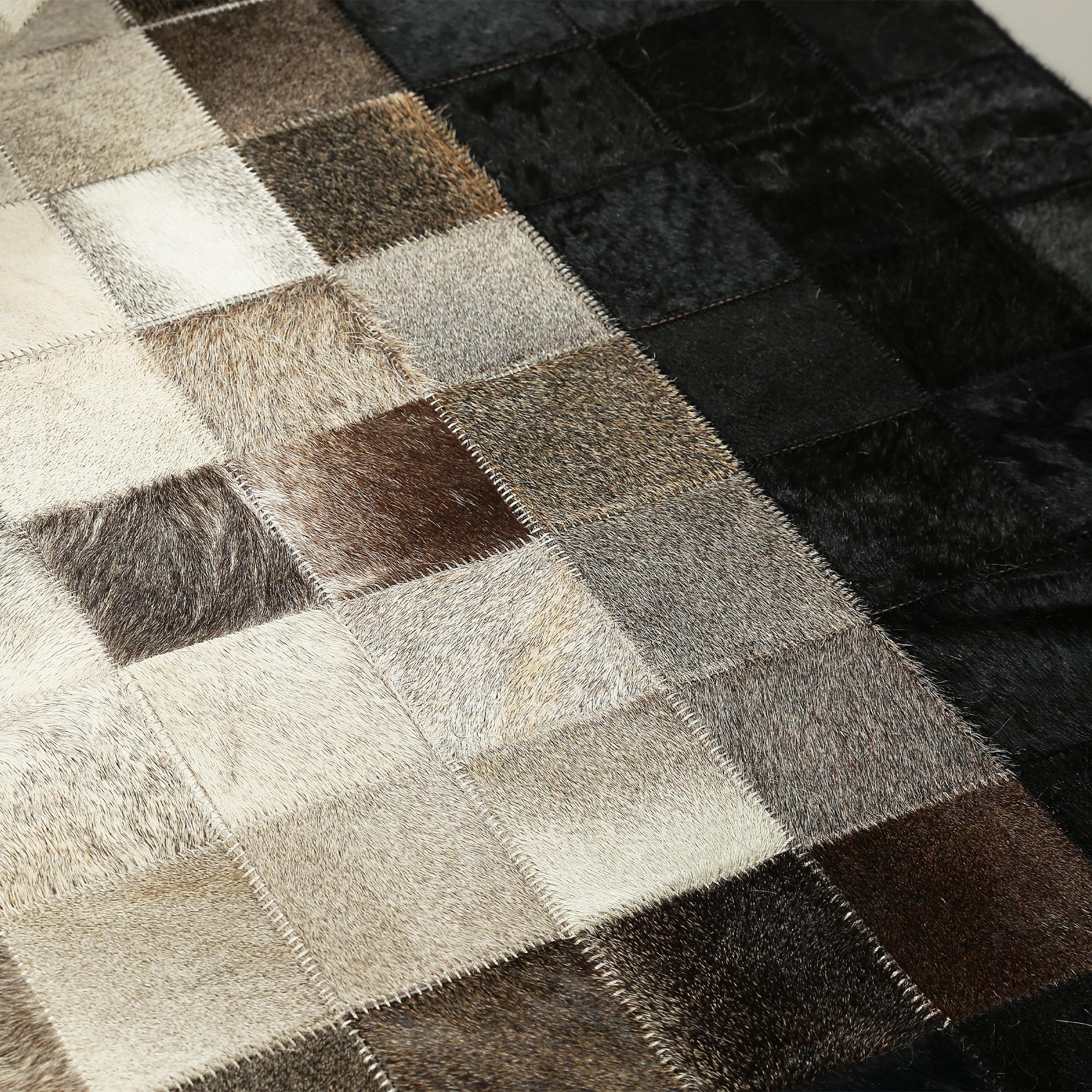 Meticulously handcrafted from authentic calfskin, this living room carpet offers unmatched durability and comfort. Its unique patchwork design ensures that each rug is one of a kind, while its timeless appeal makes it an excellent choice for your home or a thoughtful housewarming carpet gift.