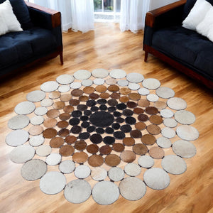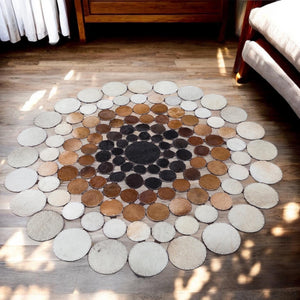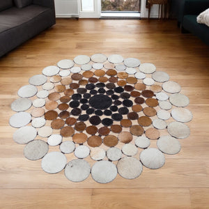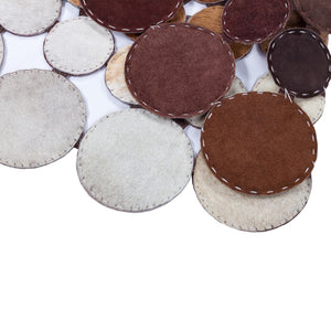 Handmade Brown Cowhide Polkadot Rug, Unique Round Patchwork Leather Carpet