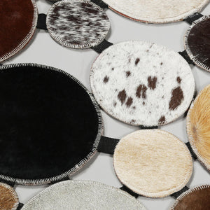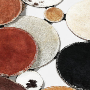 This handmade round cowhide rug showcases a striking multicolor polkadot patchwork design with natural shades of brown, black, white, and beige. Crafted from 100% genuine cowhide, it is durable, stylish, and the perfect statement piece for any living room, bedroom, or entryway.