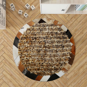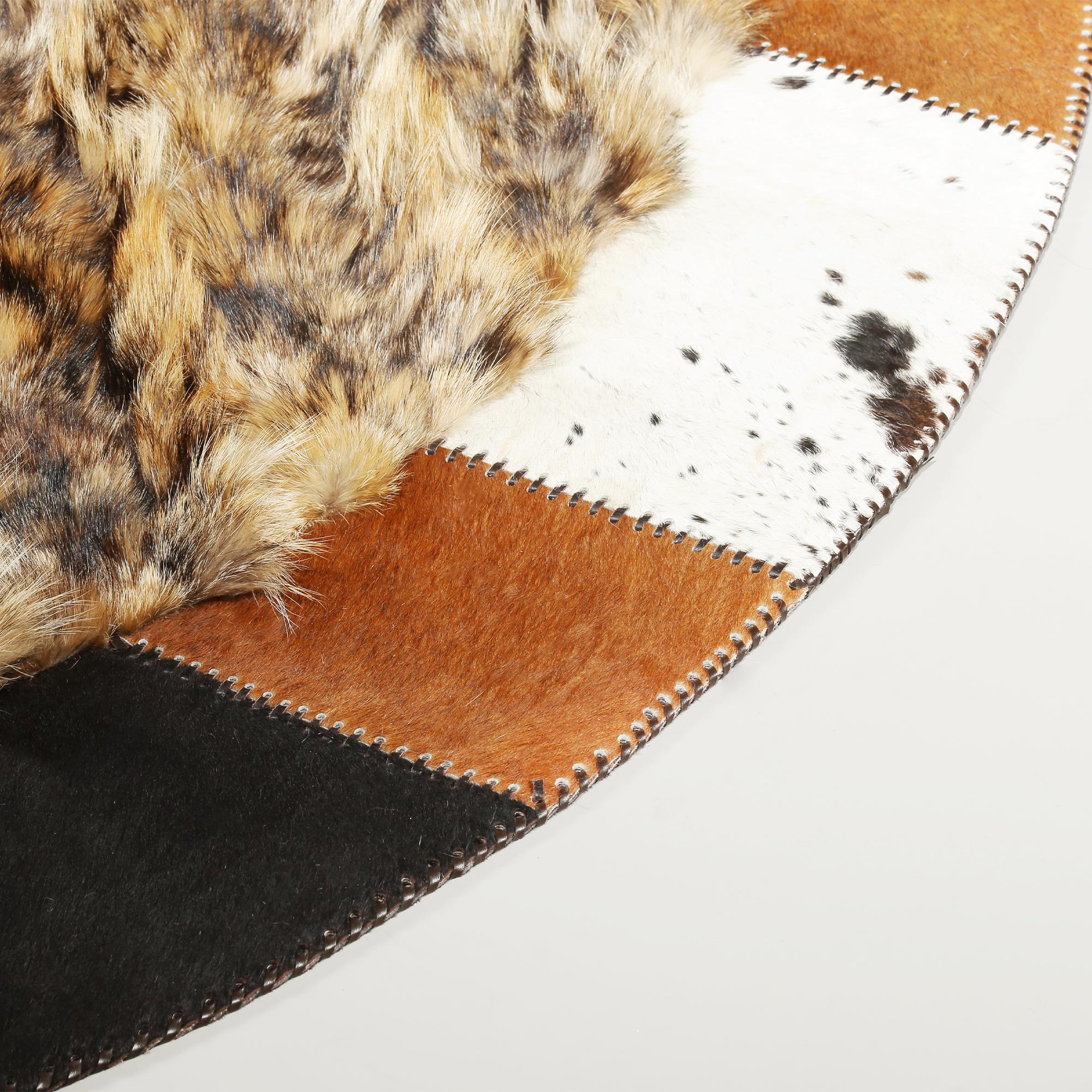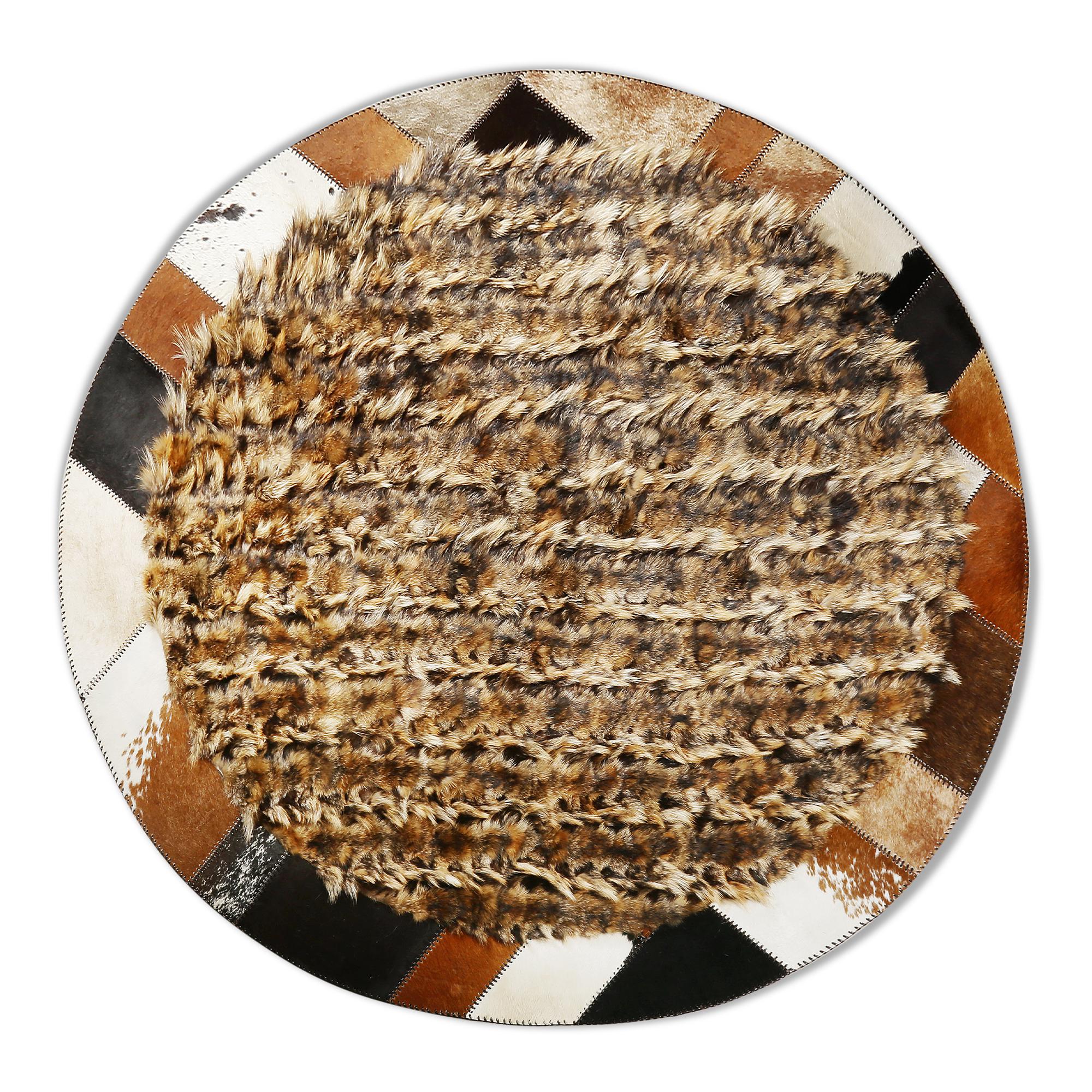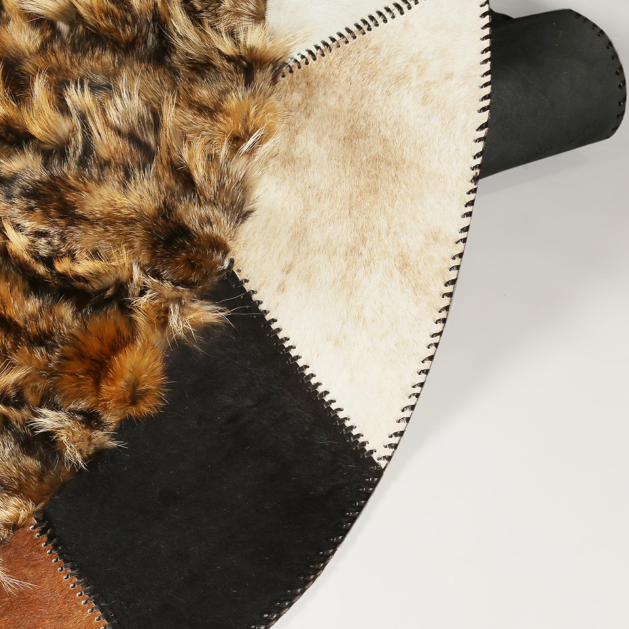 Round Fox Fur and Cowhide Rug, Handmade Natural Fur Circle Carpet, Luxury Mixed Material Rug