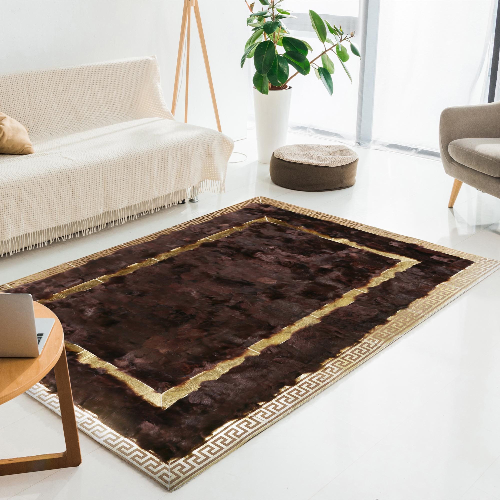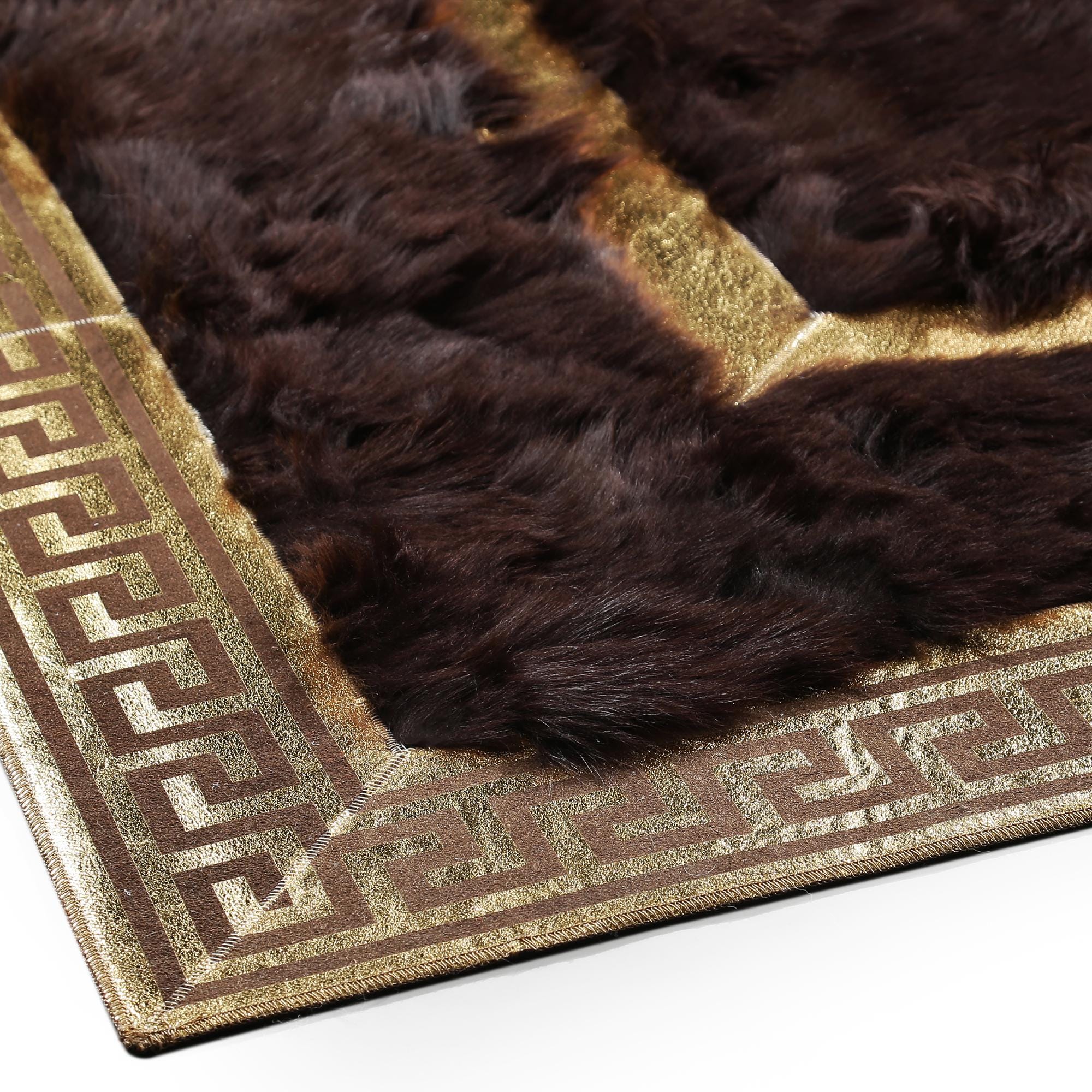 Introduce warmth and sophistication to your home with the Gold Framed Brown Tuscan Rug. Crafted from genuine sheepskin fur, this luxurious shaggy carpet features a rich brown hue accented with a gold frame for a touch of elegance. The curly long fur texture adds depth and softness, making it a standout piece for living rooms, bedrooms, or offices. This high-quality Tuscan carpet is both stylish and durable, perfect for creating a cozy and refined atmosphere. An ideal housewarming gift or a stunning addition to your own space.