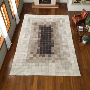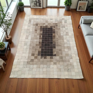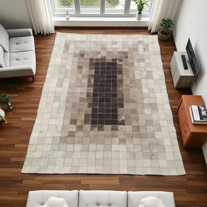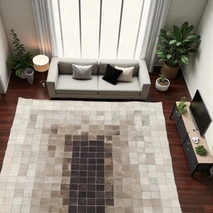 Crafted from premium genuine cowhide, this handmade rug features a sophisticated gradient design that fades from dark brown at the center to soft beige edges. The patchwork layout highlights the natural variations in texture and tone, offering both visual depth and timeless style. Its durable leather construction makes it suitable for high-traffic areas while maintaining a luxurious feel. This rug is a functional yet elegant choice for modern interiors.