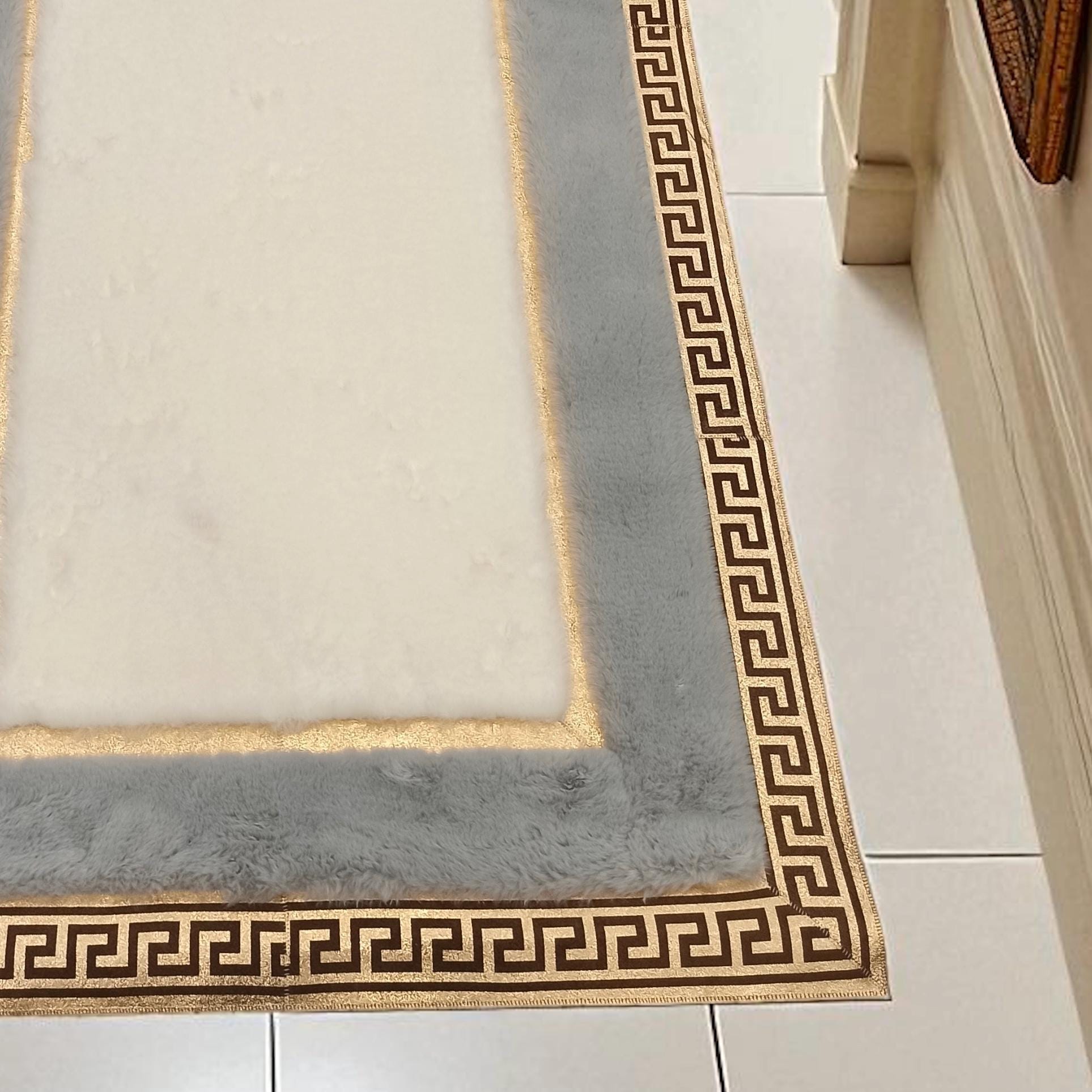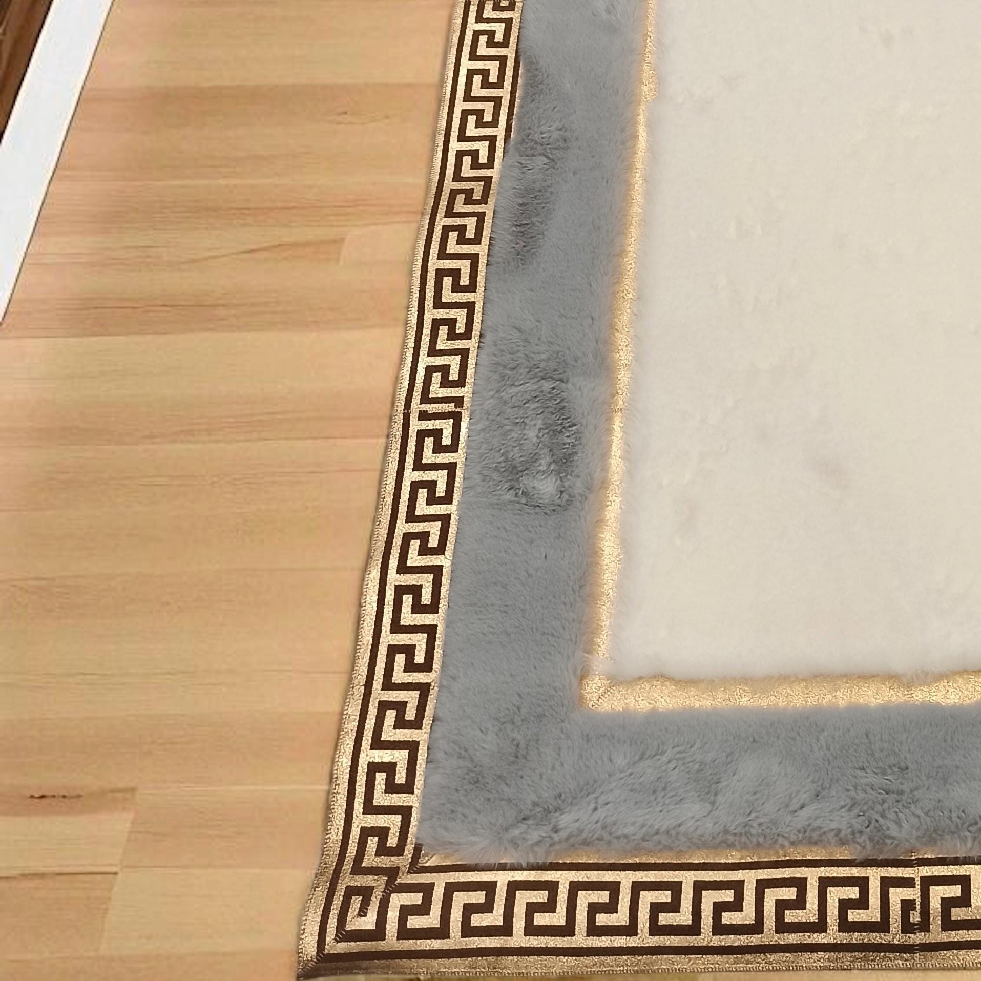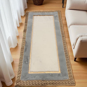 This plush runner rug features a white central panel framed by a soft gray border, finished with a shiny gold Greek key design. Made with ultra-soft synthetic fur, it provides cozy comfort and elegant style underfoot. Perfect for hallways, entryways, or bedside areas, this modern rug adds a luxurious touch while maintaining durability for daily use. Custom sizing is available.