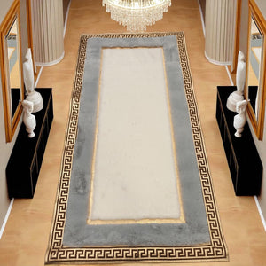 Gray and White Plush Runner Rug with Gold Greek Border, Soft Custom Size Long Area Carpet, Modern Hallway or Entryway Rug